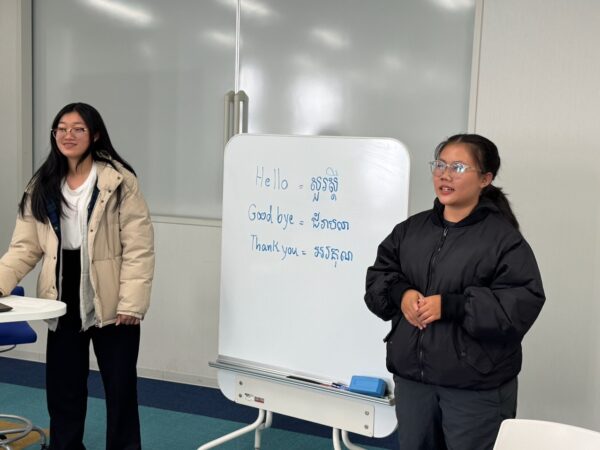 今週は、カンボジアから来日中の学生、ゲクソンさんとマイマイさんを歓迎いたしました。冬の日本に着いたばかりにもかかわらず、2年生の授業に参加し、カンボジアについての興味深い発表をしてくれました。その後、本学の学生たちはグループに分かれ、日本とその文化について短い発表を行いました。大変楽しい午後となり、今週末に成人式を迎える全生徒を祝福する機会となりました。