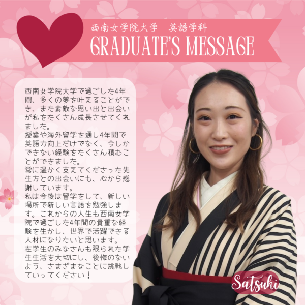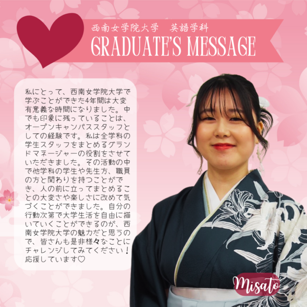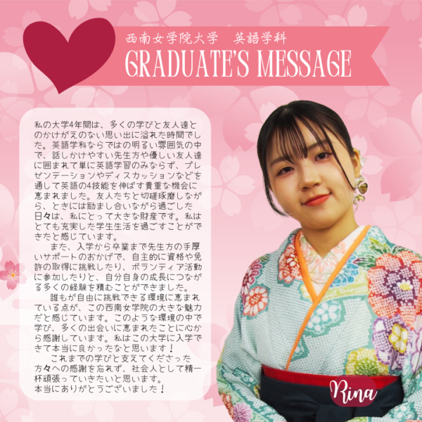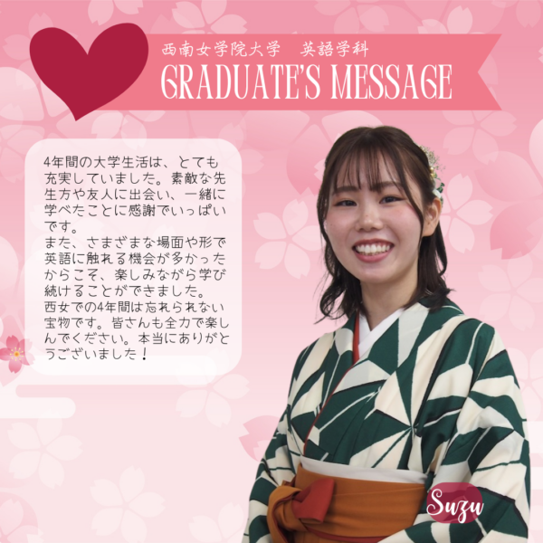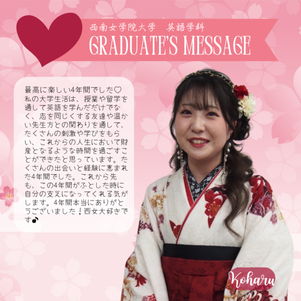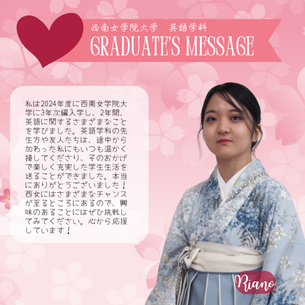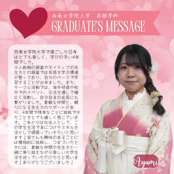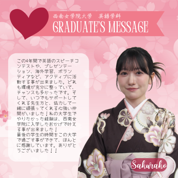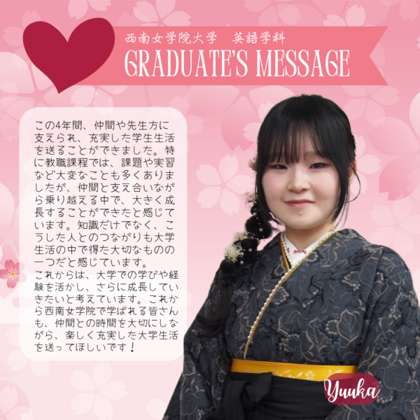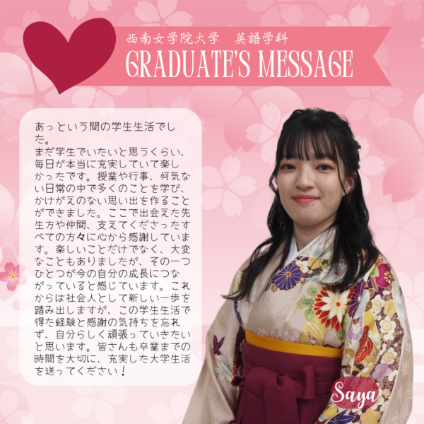 Home/Seinan/Information/News/2025 English Department Graduate Messages News 2025 English Department Graduate Messages 2025年度 英語学科 卒業生からのメッセージ Share Facebook X Share via Email Here are some messages from our 2025 graduate students. Share Facebook X Share via Email Share Facebook X Share via Email Print