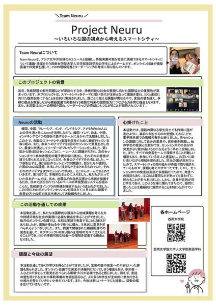 神戸大学で行われたRCEユース会議に出席しました。RCEとはRegional Centre for Expertise on Education for Sustainable Developmentの略で、国連大学が認定する持続発展教育の地域の拠点で、北九州もその一つなので、私たちもユースメンバーとして活動しています。今年は「交差する知と実践〜ユース・実践者・研究者が描くESDのこれから〜」がテーマで、講演やポスターセッション、ワークショップ等に参加しました。日本中のESDを実践している研究者、行政官、起業家、学生などが出席されていて、多様な立場の方々と交流する貴重な機会となりました。私たちはポスターセッションでアジア太平洋地域のユースと行なった模擬国連についてと、ゴミを拾いながらジョギングを行うプロギングというイベントについて発表を行いました。他の参加者と意見交換を行う中で、多様な考え方や実践に触れることができました。本活動を通して、SDGsやESDへの理解が深まるとともに、社会課題を自分ごととして捉える意識や、主体性・協働の大切さを学びました。今回の経験を今後の学びや活動に活かしていきたいと考えています。